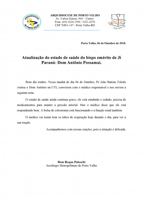 Abaixo (outras fotos) segue as notas de atualizações, boletins médicos, dos dias 06, 07 e 08 de outubro, públicada por Dom Roque Paloschi, Arcebispo Metropolitano de Porto Velho.