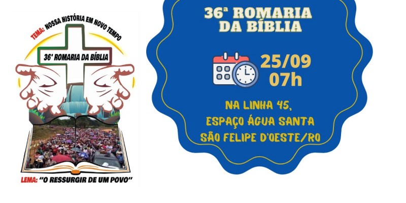 A Paróquia Nossa Senhora de Fátima, em Pimenta Bueno/RO, convida todos a participarem da 36ª Romaria da Bíblia, que este ano acontecerá presencialmente no dia 25 de setembro de 2022, na Linha 45, Espaço Água Santa, São Felipe D’Oeste/RO.