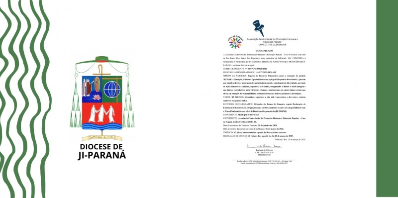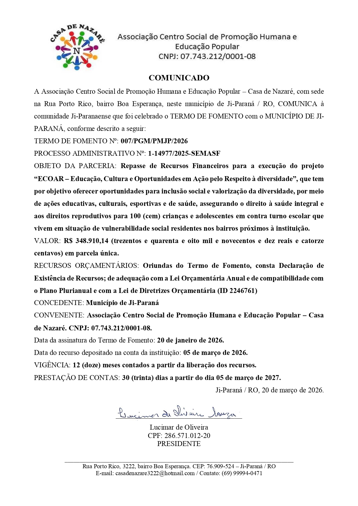 A Associação Centro Social de Promoção Humana e Educação Popular – Casa de Nazaré, com sede na Rua Porto Rico, bairro Boa Esperança, neste município de Ji-Paraná / RO, COMUNICA à comunidade Ji-Paranaense que foi celebrado o TERMO DE FOMENTO com o MUNICÍPIO DE JI- PARANÁ, conforme descrito a seguir: